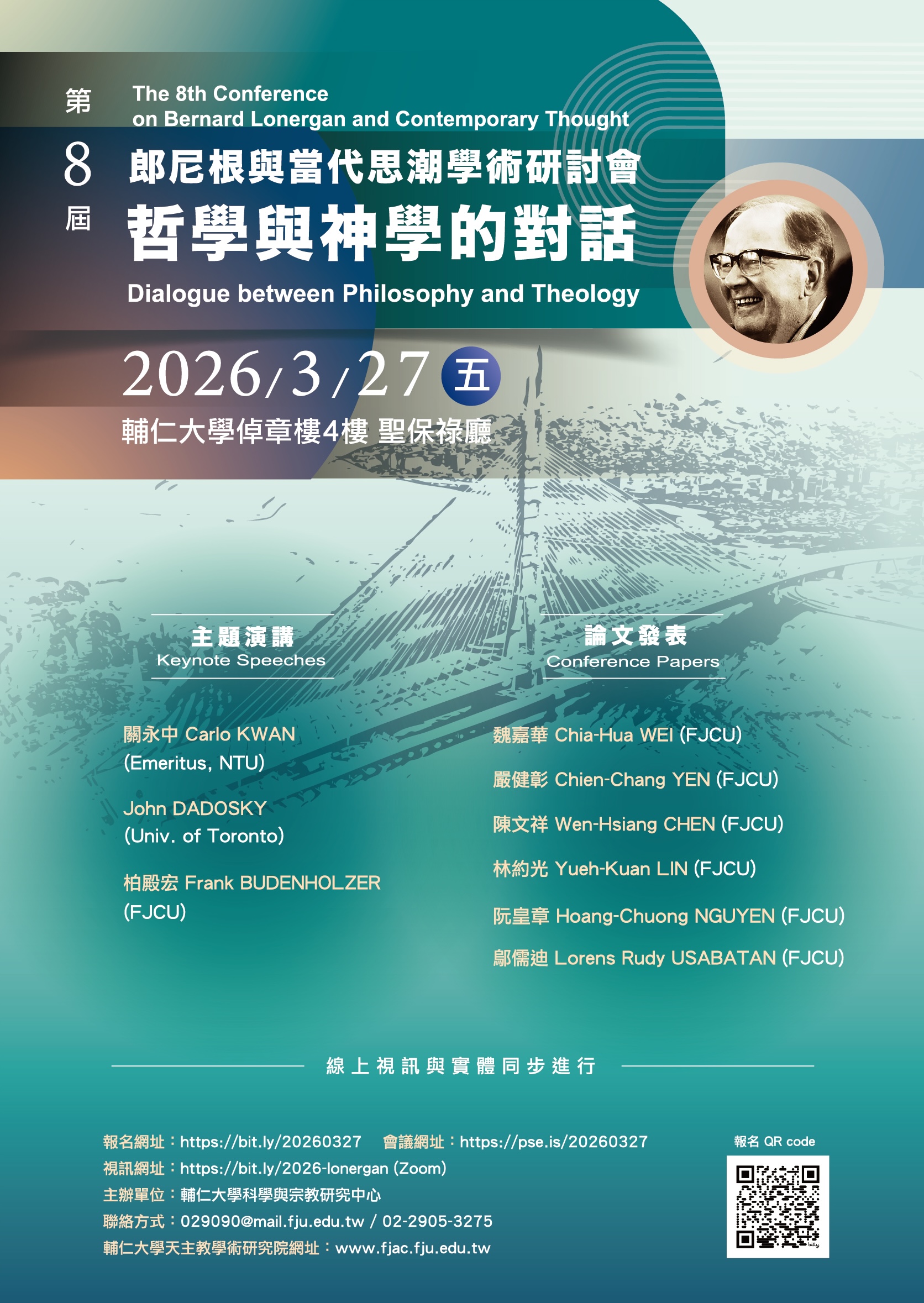 謹訂於2026327日(週五)舉行「第八屆郎尼根與當代思潮學術研討會:哲學與神學的對話」歡迎對郎尼根(Bernard Lonergan)思想有興趣者踴躍報名參加(線上視訊與實體同步進行)
